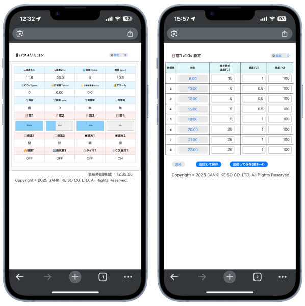 「ハウスリモコン」を利用することで、PCやスマートフォンから環境データの確認や設定変更が行える。ハウス内外を問わず、無線LANの範囲であれば操作可能。来園者対応で忙しくても状況を把握し、必要に応じて調整できる。これは観光農園にうってつけの機能に違いない。クラウド契約や月額費用は不要なのも嬉しい。